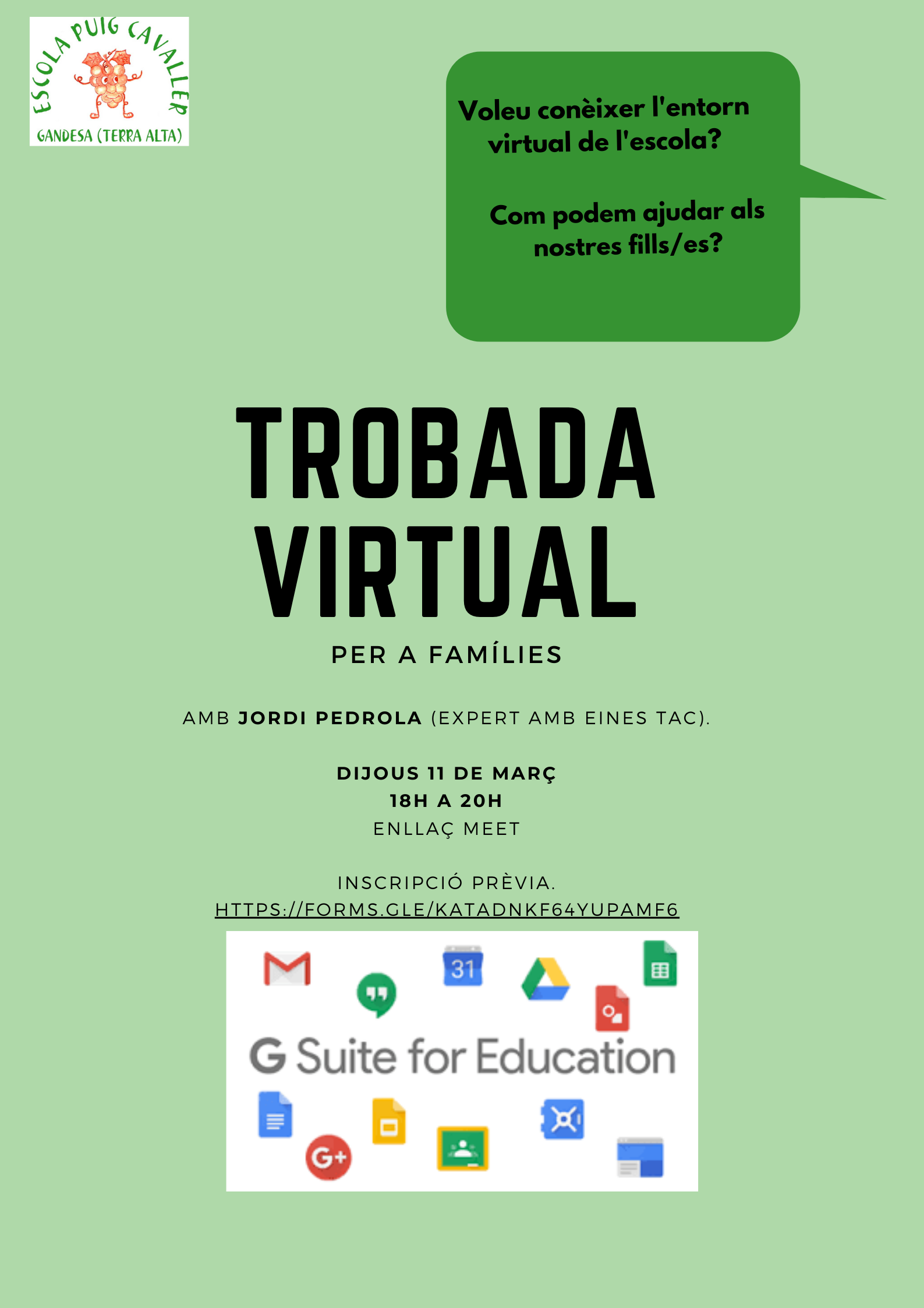 TROBADA VIRTUAL Feu un comentari / Per sonia / 27 de febrer de 2021 / comunitat grans Comunitat Mitjans Comunitat petits General Portada / #transformació digital INSCRIPCIONS A L’ENLLAÇ SEGÜENT: https://forms.gle/kaTadNkf64yUpAmf6