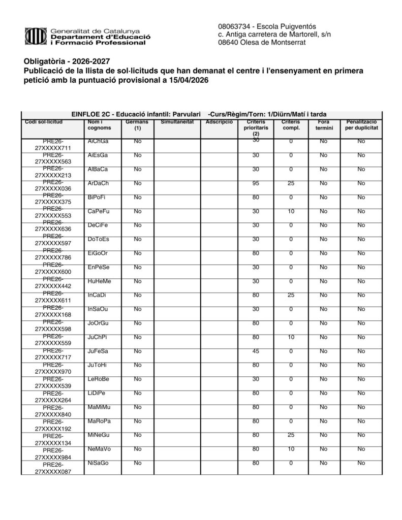Llista de sol·licituds que han demanat el centre en primera petició i amb la puntuació provisional admin17/04/26