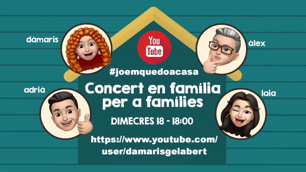 Bon dia famílies! Avui us volem informar que a partir de les 18:00h la Damaris Gelabert fa un concert (des del seu canal de Youtube) per cantar i ballar des de casa! Us animem a tots que el mireu i en gaudiu. Esperem ques estigueu tots bé i desitjant retrobar-nos ben aviat!