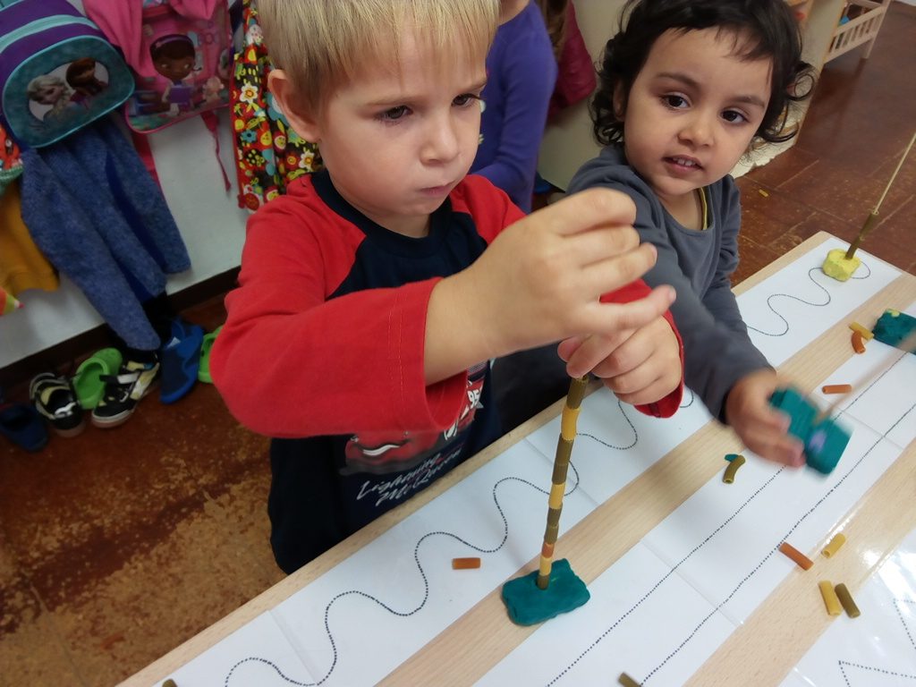 Una altre opció és enfilar pasta amb canyetes de suc. Si hi poseu una boleta de plastilina, o una esponja a la base els hi serà més fàcil.