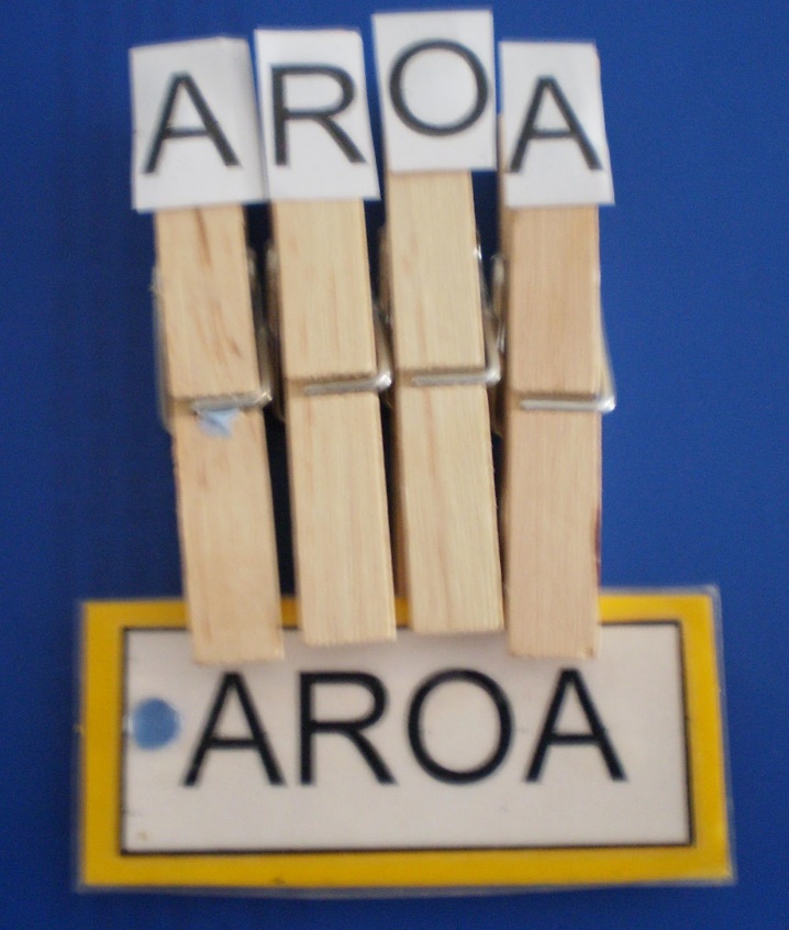 També podeu aprofitar per escriure el nom dels altres companys, dels membres de la família…amb agulles d’estendre la roba. A les agulles hi podeu escriure les lletres en majúscula, a cada agulla una lletra. I en un tros de paper escriure el nom que han de confegir.