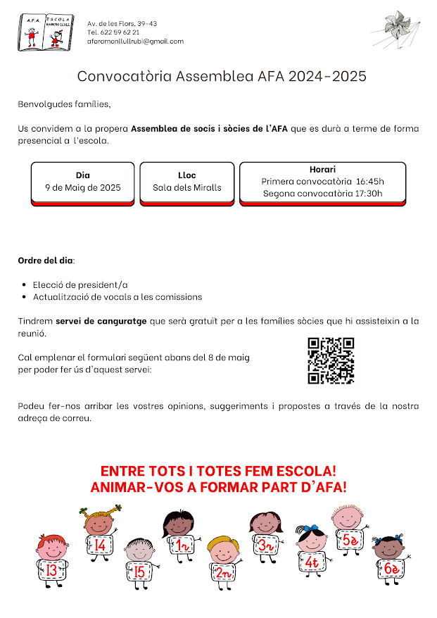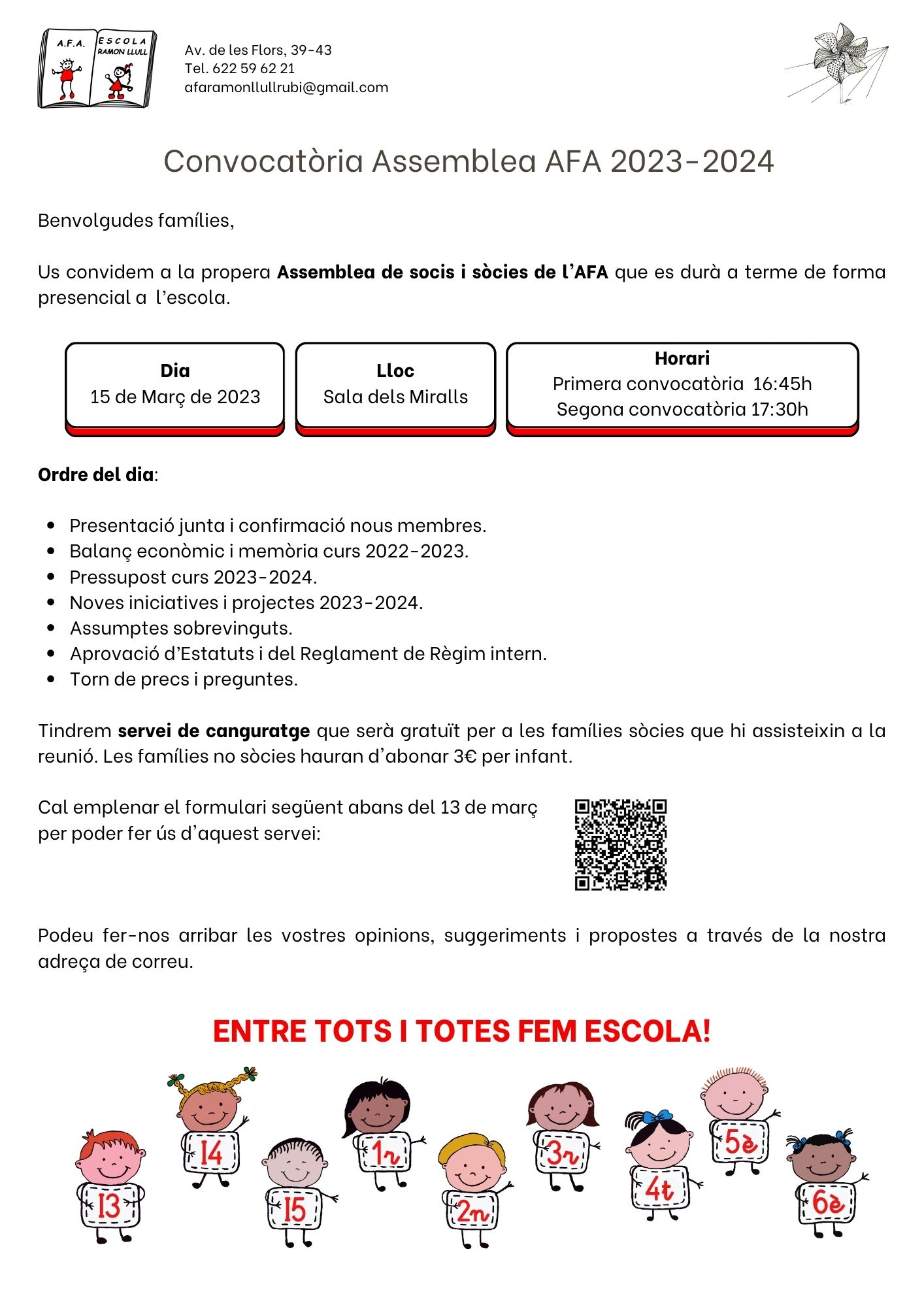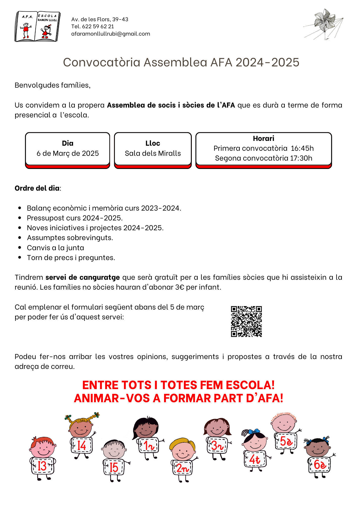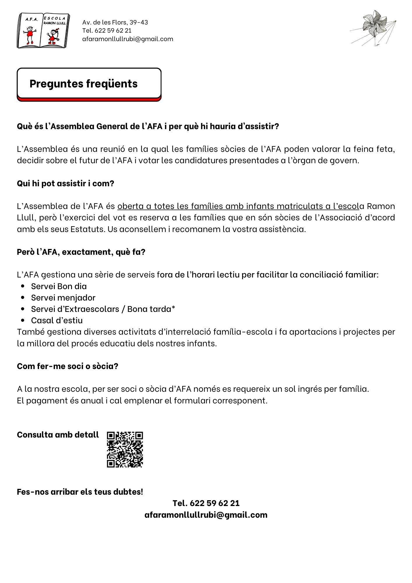 Agraïm la màxima presència en aquesta assemblea i convidem que les famílies es facin membres d’AFA.