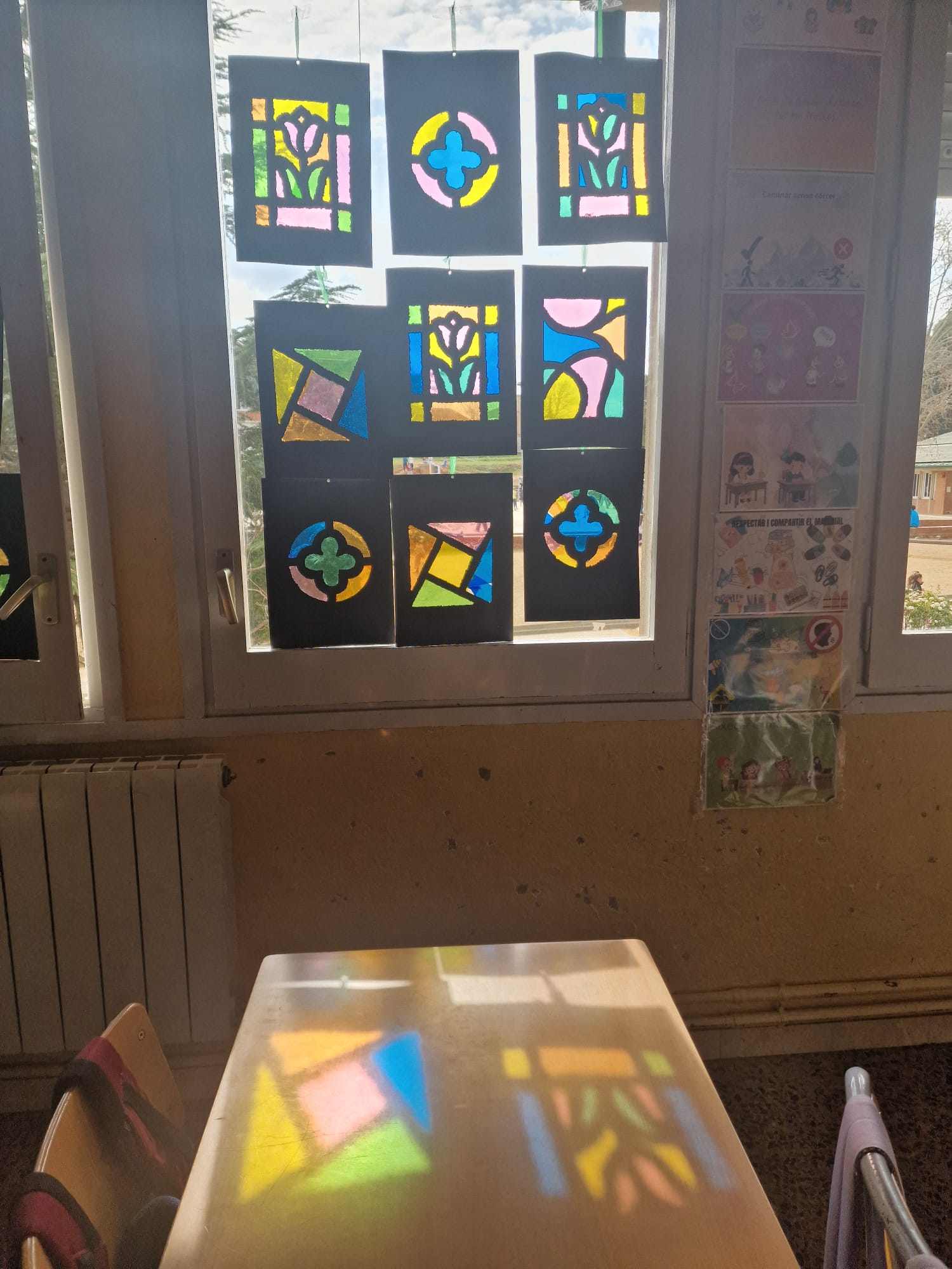 Ara que ja estem gairebé acabant el tema, hem volgut tancar aquest aprenentatge amb un producte final molt especial: la creació de vitralls inspirats en els que decoraven les esglésies medievals. Els infants han elaborat els seus propis vitralls, utilitzant colors i formes geomètriques per simular l’efecte de la llum que travessa el vidre.