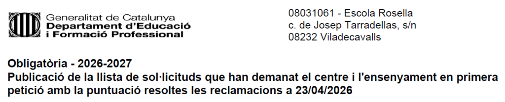Aquí trobareu tota la informació sobre el procés de la preinscripció del curs 26-27. LLISTAT AMB LA PUNTUACIÓ PROVISIONAL Cliqueu aquí per enllaçar a la pàgina del Departament d’Educació i Formació Professional Oferta inicial de places Oferta inicial de places LLISTAT AMB LA PUNTUACIÓ PROVISIONAL