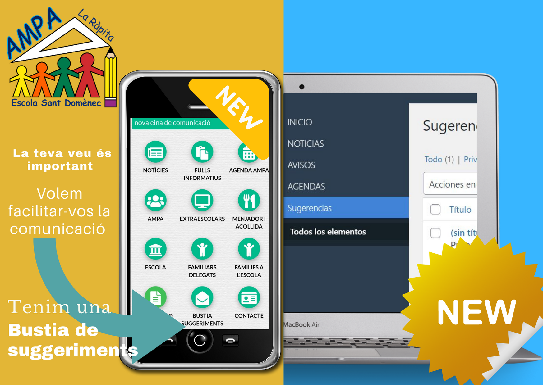 Nova eina de comunicació: la bústia de suggeriments Feu un comentari / Per AMPA ESCOLA SANT DOMÈNEC / 19 de febrer de 2021 / INFORMACIONS DE L'AMPA / App, Novetats Des de l’AMPA volem tenir una comunicació més activa, la teva veu ens importa! Per això, hem afegita l’aplicació una bústia de suggeriments! Volem #LAmpaMésAProp