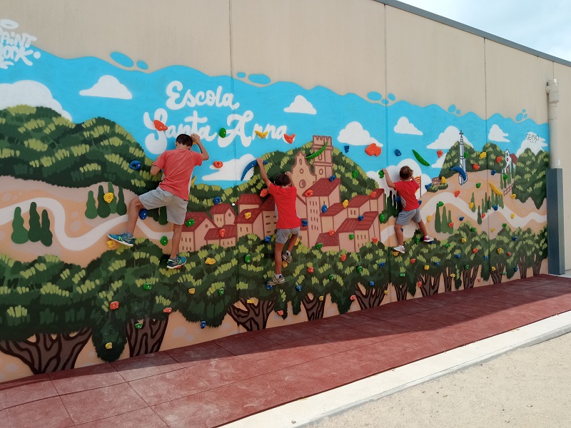 - la realització d’un mural i un rocòdrom en una de les parets del pati, que ens permet practicar: l’agilitat, l’equilibri, guanyar força i flexibilitat…i a més a més és divertit perquè ho podem practicar en grup.