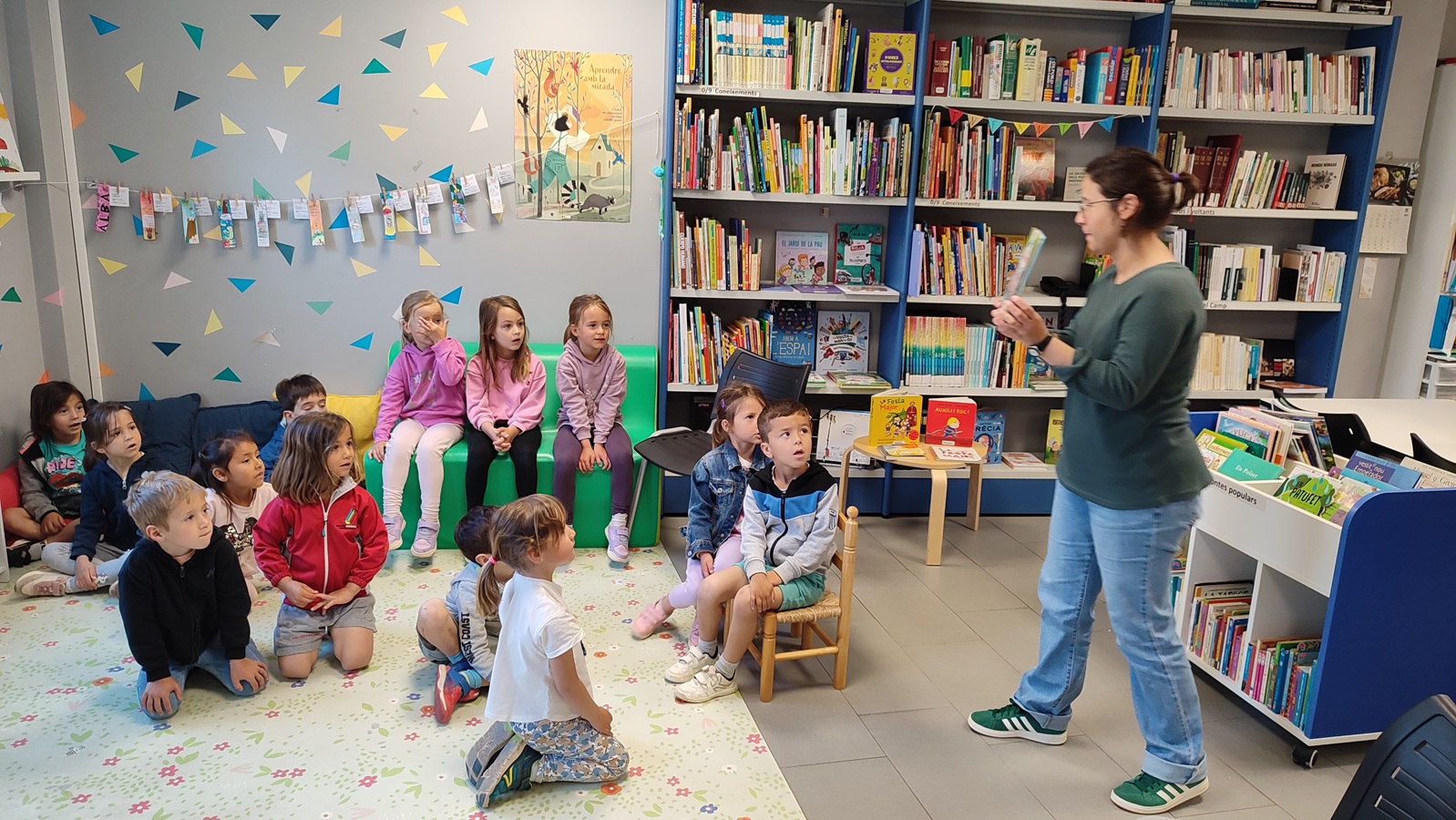 Des d’I3 a 1r, hem dedicat un matí o una tarda a visitar la biblioteca, per descobrir, mirar i llegir contes … i sobretot, gaudir del moment màgic en que l’Alba Miró, la bibliotecària, amb molt d’encert i professionalitat ens ha explicat quins són els contes que podem trobar a la biblioteca, i ens ha dit que si els volem continuar mirant o llegint a casa, només cal demanar-los en préstec.