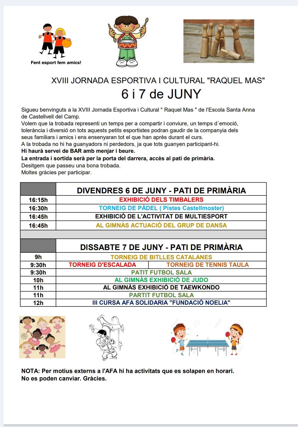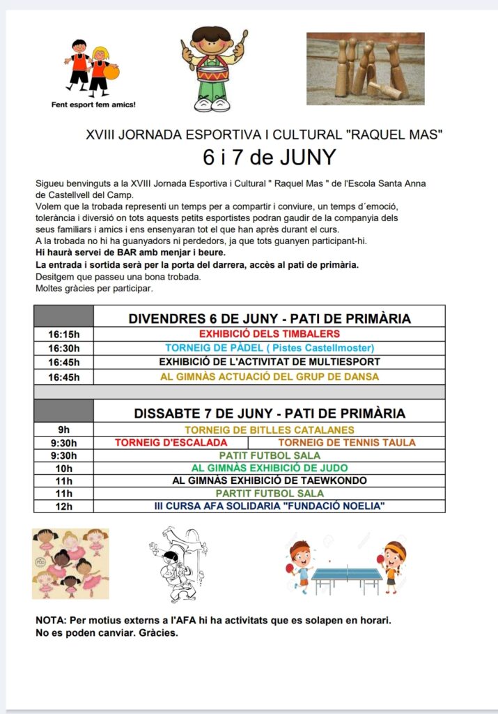 El divendres 6 i el dissabte 7 de juny, com cada any i ja en fa 18, l’AFA de l’Escola ha organitzat la Jornada esportiva i cultural “Raquel Mas”. Durant aquestes Jornades els infants i les famílies podran compartir esports, jocs, música i ball.