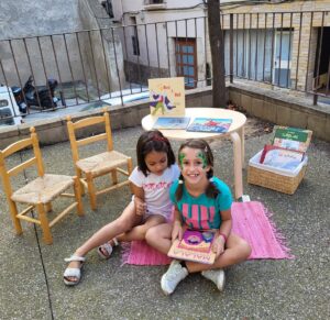 - llegint els llibres seleccionats per l’Alba de la Biblioteca municipal a l’espai tan acollidor que va preparar