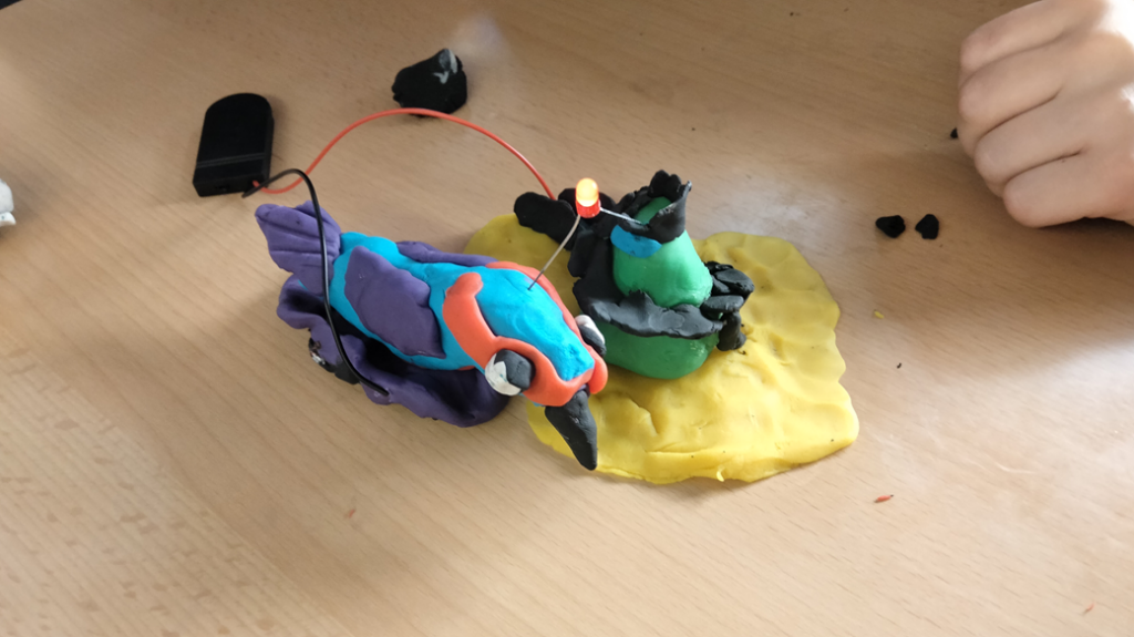 Hem après sobre la importància del reciclatge de piles i bateries, l’impacte ecològic si no es dipositen a la deixalleria o als contenidors específics que tenim a l’escola, el que suposa participar com a escola a la campanya Apilo XII, i també hem creat unes figuretes amb un tipus de plastilina que conté aigua (component conductor) que per mitjà d’uns cables podien encendre una bombeta led gràcies a la corrent generada per la pila de botó.