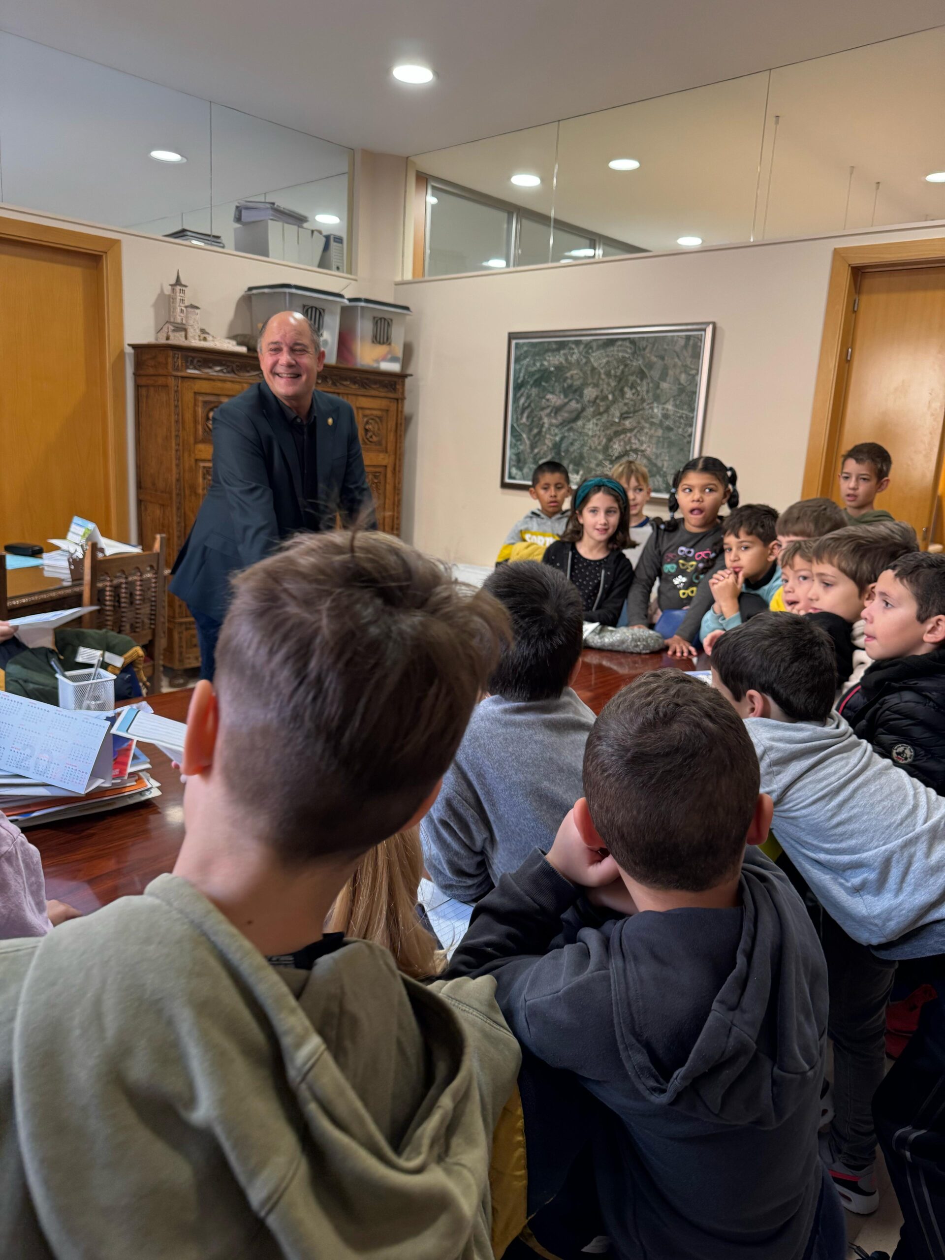 Amb un gran somriure, l’alcalde ens ha explicat en què consisteix la seva feina: vetllar pel benestar de totes les persones del poble. El seu dia comença ben d’hora, saludant tothom i assistint a reunions per prendre decisions importants.