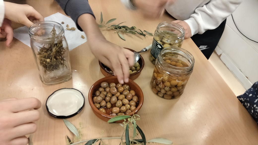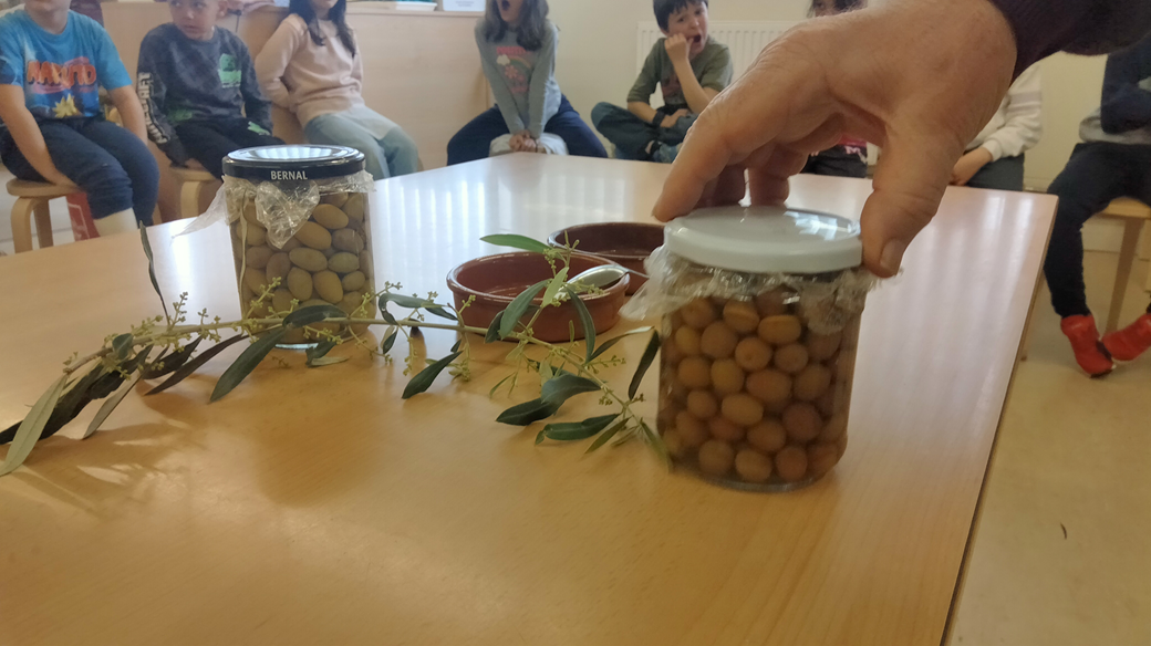 Al mes de novembre, mentre estàvem aprenent a classe sobre l’olivera i la producció de l’oli, el Sergi, company de 3r, va aparèixer amb un parell de pots d’olives en conserva. Ens va dir que les havia fet el seu avi Josep i que calia esperar a menjar-les. Les vam estar observant durant uns mesos fins que al mes d’abril vam convidar-lo a que ens expliqués què i com havia fet aquelles olives. L’únic que sabíem era que tots dos pots contenien olives diferents perquè unes eren rodones (arbequines, ho vam aprendre amb el pagès Jaume) i les altres allargades (desconegudes per a nosaltres).