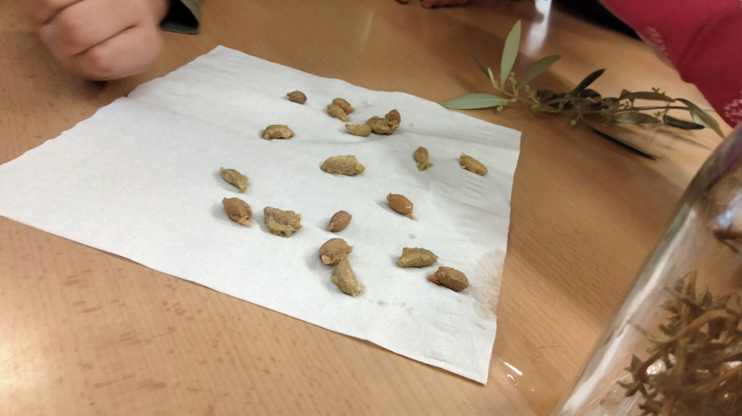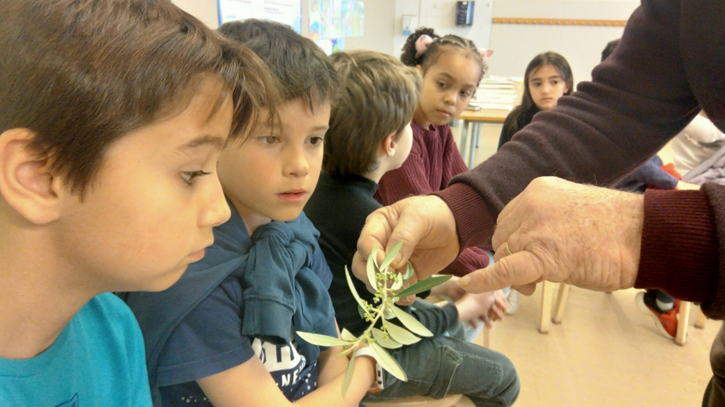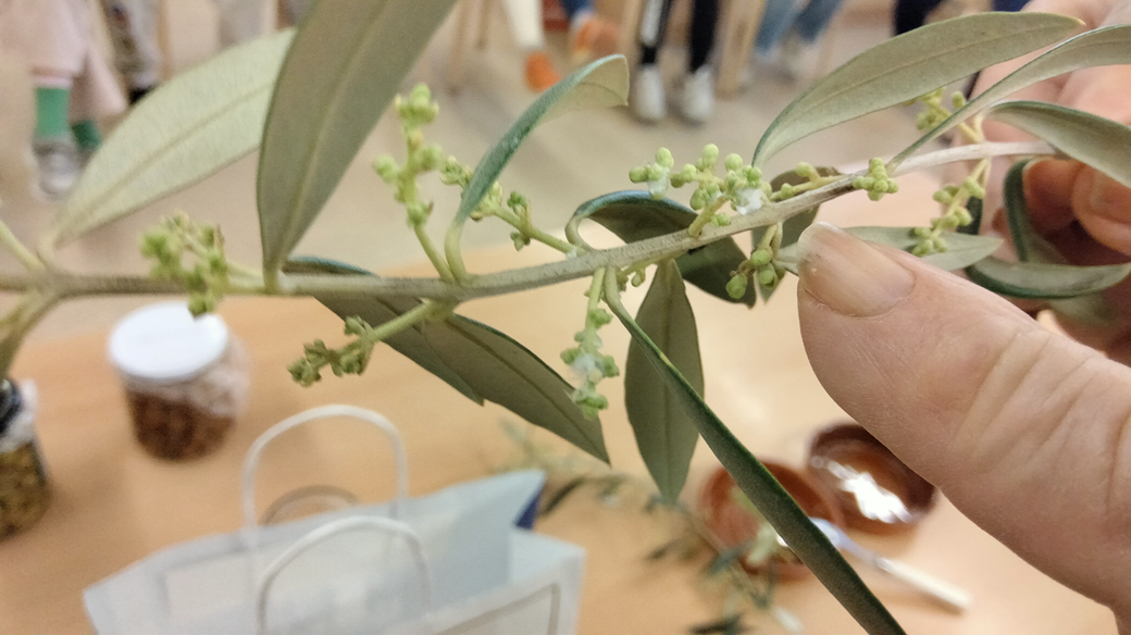 El Josep ens explica que cal observar la natura i ens mostra una branqueta d’olivera. Ens explica que l’oliva sorgeix a partir de la flor i aquesta surt entre les fulles durant aquests dies fantàstics de primavera. Si observem els camps per Setmana Santa començarem a veure oliveres florides! L’autofecundació de les flors es fa durant el mes d’abril i maig per mitjà del seu propi pol·len que es transportat pel vent!