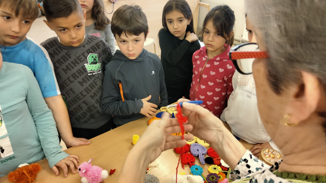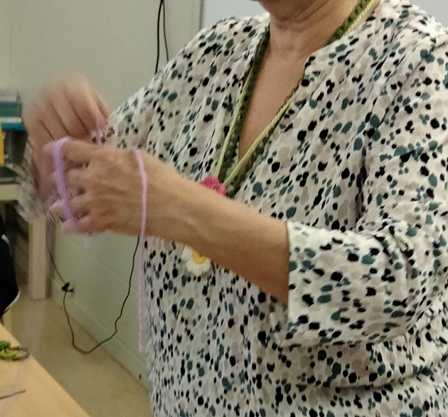 L’Angus és coneguda a la classe perquè és molt generosa. Sense demanar res, i mitjançant la seva neta Olívia, ens ha fet arribar i regalat uns cors i flors de ganxet a cadascú de nosaltres. Les portem lligades a la motxilla com a mostra d’agraïment i comunió col·lectiva! Així doncs, vist l’èxit del seu esforç i amabilitat, vam creure oportú convidar-la a compartir-nos el seu procés artesà.