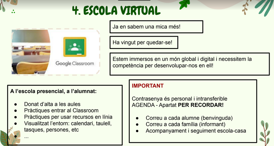 A la reunió pedagògica d’inici de curs es va informar a les famílies del sentit de l’Entorn Virtual d’Aprenentatge del Classroom.