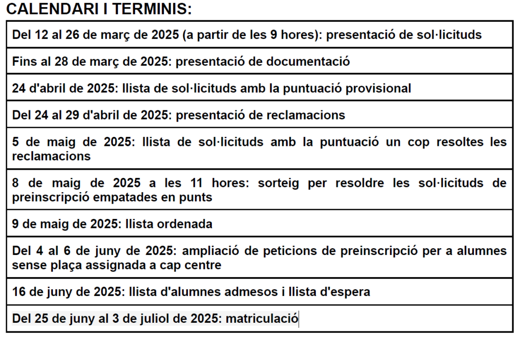 Cenyiu-vos al calendari establert. Presentar la sol·licitud o la documentació fora de termini us fa perdre tots els drets d’adscripció, amb el risc que això comporta de quedar-se sense plaça al centre.