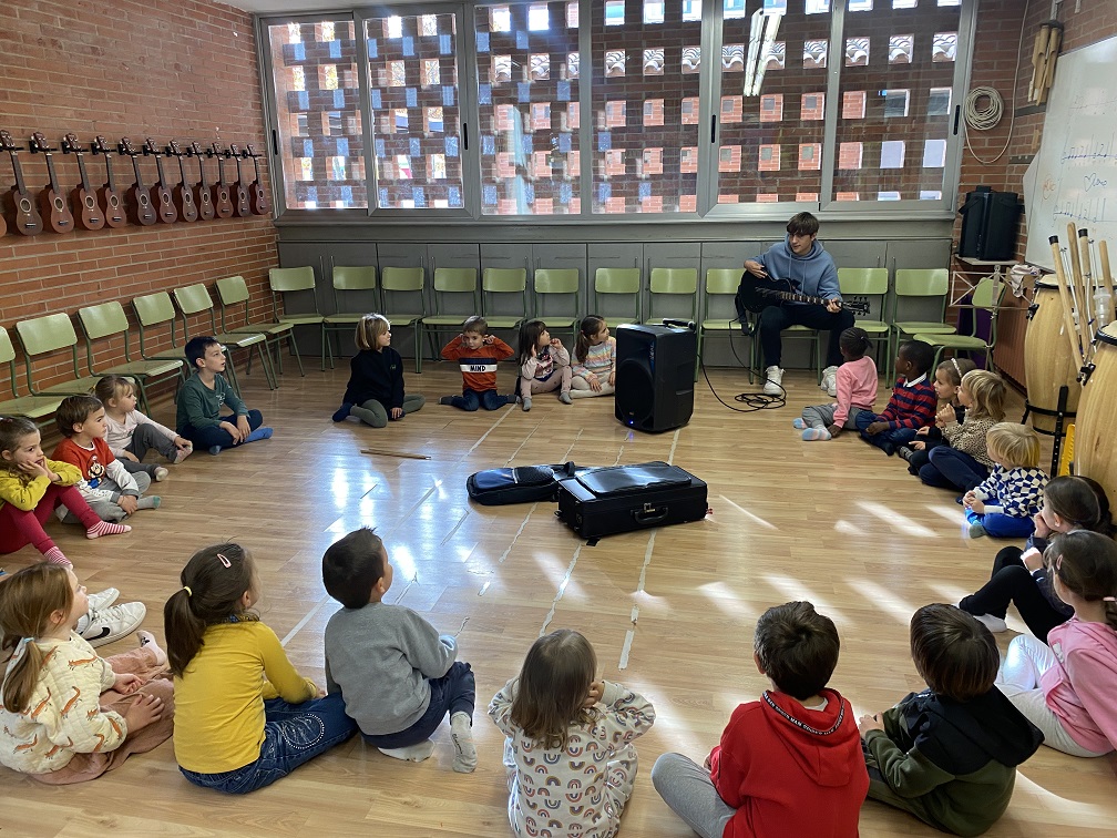 Avui, el grup d’infantil blau hem tingut la sort de gaudir de la visita de tres joves de 3r d’ESO de l’institut Manuel de Montsuar que han vingut a explicar-nos què és ser músic i quins instruments toquen.