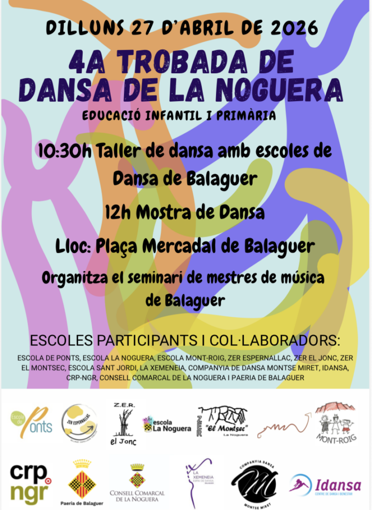 Un any més, els nens i nenes de 2n hem anat a la capital de la Noguera a gaudir d’una jornada plena de dansa. Ahir, 27 d’abril, va ser el dia escollit per celebrar aquesta trobada, trobada que realitzem per commemorar el dia internacional de la dansa, que serà demà 29 d’abril.