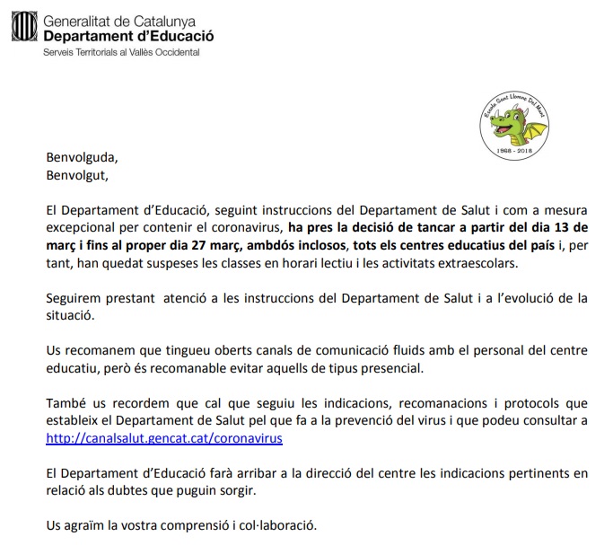 Benvolgudes famílies, INFORMEM que a partir d’avui divendres 13 de març fins al 27 de març (ambdós inclosos). L’ESCOLA ROMANDRÀ TANCADA. Us adjuntem el comunicat sobre el tancament dels centres educatius per part del Departament d’Educació. CARTA FAMÍLIES
