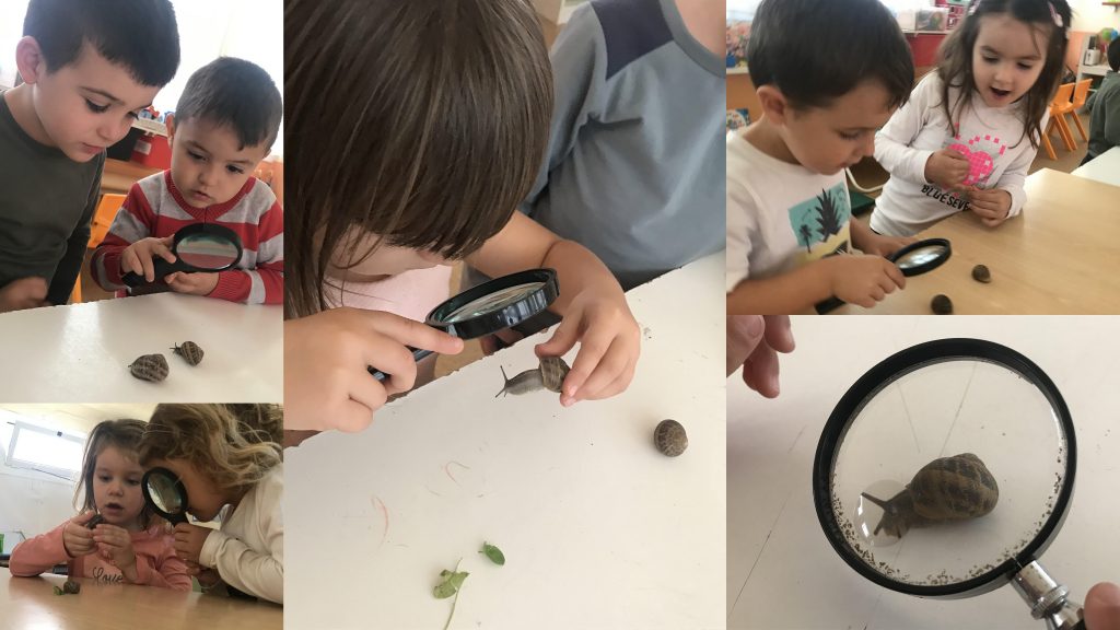 Amb les lupes hem mirat com són els ulls, la boca, les banyes, la closca… Per no perdre’ns cap detall! Encara hem de descobrir moltes més coses dels nostres cargols, però aquests dies gaudim d’allò més tocant-los i observant-los!