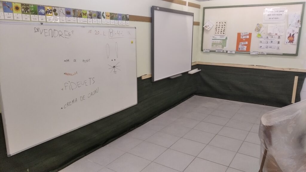 Durant aquestes vacances de Setmana Santa, l’Excm. Ajuntament ha fet unes obres importants a l’aula d’Educació Infantil, P5. S’ha procedit a tractar la humitat ascendent per capilaritat, amb un tratament sobre el mur i també s’ha instal·lat una màquina CTA per tractar les condesacions que es produeixen a l’aula.