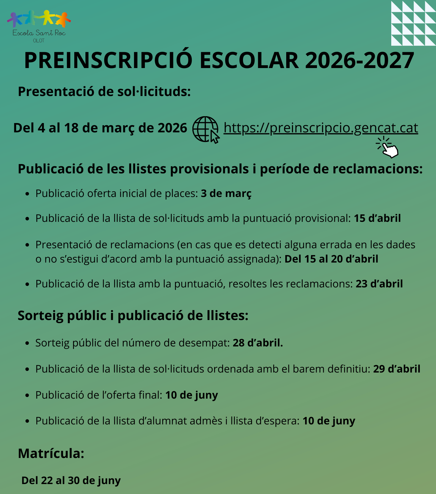 Aviat començarà el període de preinscripció i matrícula escolar. Anoteu-vos bé les dates. Preinscripció ’26