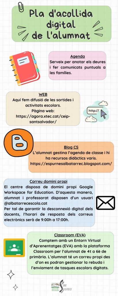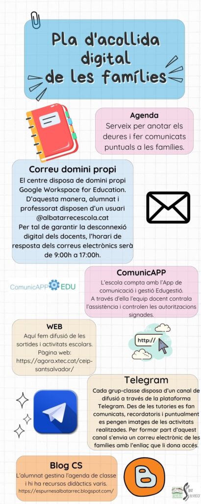 La nostra escola es caracteritza per una comunicació molt fluida i directa amb l’alumnat, les famílies i els diferents professionals que hi treballen. S’estableixen diferent canal de comunicació, tenint present que el principal és el diàleg personal.