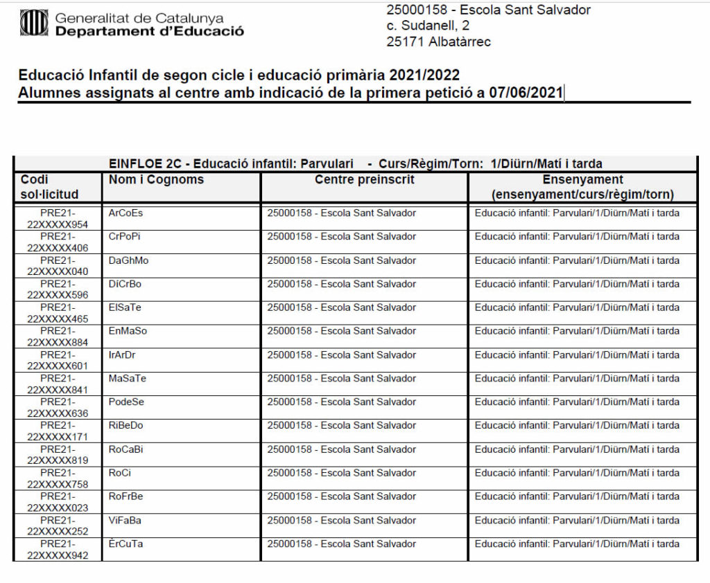 • Educació Infantil de segon cicle i educació primària 2021/2022. Alumnes assignats al centre amb indicació de la primera petició a 07/06/2021.