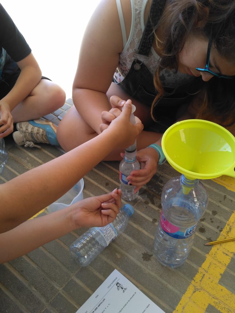 Els nens i nenes de 5è i 6è curs hem experimentat les mesures de capacitat amb ampolles diverses.