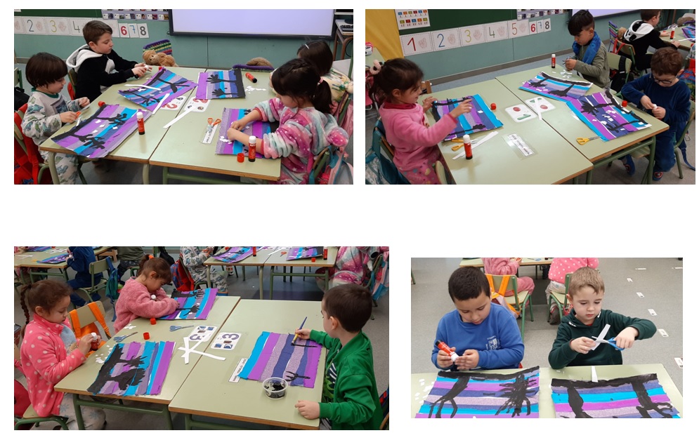 Hem treballat els colors de l’hivern, hem fet un col·lage amb paper de seda, pintura i a més hem retallat i esquinçat papers per acabar de decorar la nostra tasca.