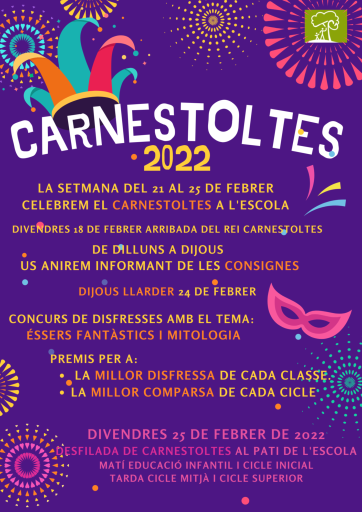 CARNESTOLTES 21-22 S’acosta el Carnestoltes i a l’escola ja estem preparant les celebracions. Al matí del dia 25 els més petits de l’escola (P3, P4, P5, 1r i 2n) sortiran al pati de l’escola a fer la seva desfilada. Hauran de portar la disfressa posada des de casa al matí. A la tarda serà el