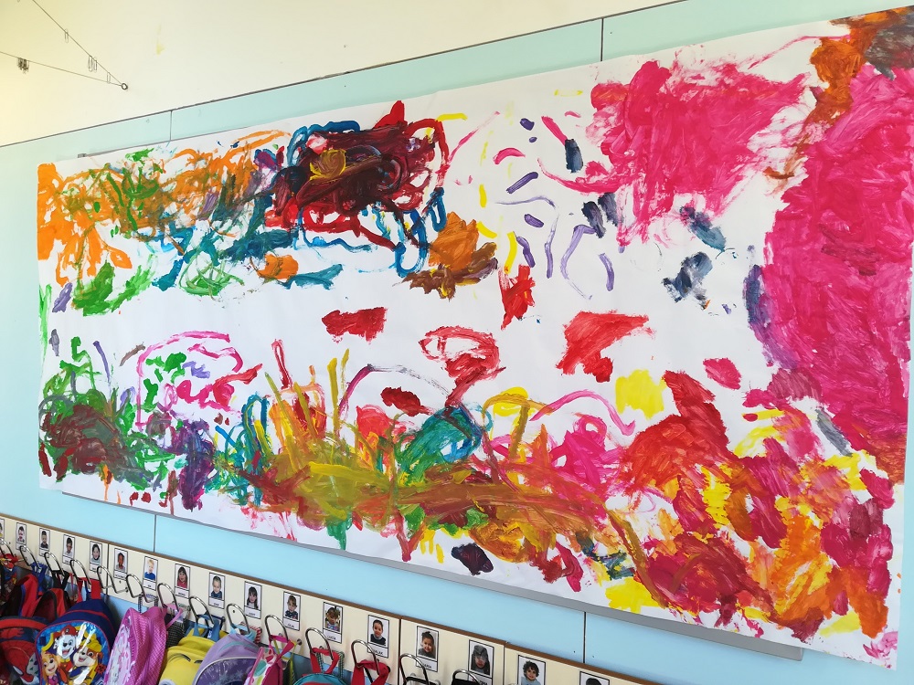 Dijous a la tarda vam gaudir del primer dia de plàstica. Vam pintar un mural gegant de molts colors, utilitzant pinzells i la nostra creativitat.