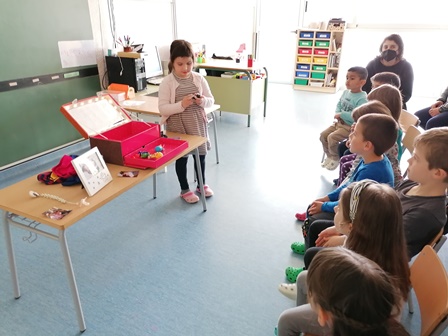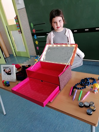 Després de la setmana de carnestoltes sense poder fer la caixa dels tresors, ja l’esperàvem amb moltes ganes. La Martina ens ha presentat la seva caixa dels tresors, una caixa de cine, amb llum, calaixos i molts secrets. Fotos, pintures de maquillatge, samarreta del Barça, joguines de Pin i Pon…Diu la Martina que li agrada molt nadar i que de gran serà infermera!