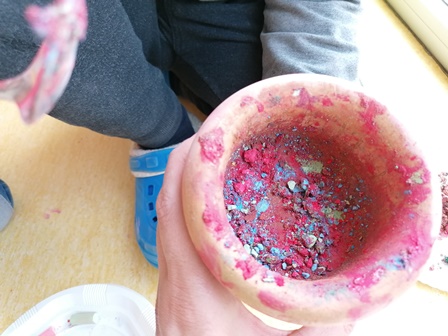 Cada divendres els nens i nenes de P4 i P5 tallem una cama a la Vella Quaresma i ens porta algun missatge amb algun joc, dinàmica, sorpesa… Avui ens ha sorprès amb un missatge que ens deia: GUIXOS!!. Hem anat al pati a fer obres d’art al terra i després, aprofitant que ahir va ploure algú ha tingut la idea de mullar els guixos i investigar què passava. Aprofitant aquest interès, a l’espai de ciències hem estat observant les seves propietats i amb un martell i un morter hem provat d’aixafar pedres i guixos i hem descobert que són molt tous, que pinten, que són enganxosos, els hem barrejat amb aigua i hem pogut observar què passa si barregem tots els colors!