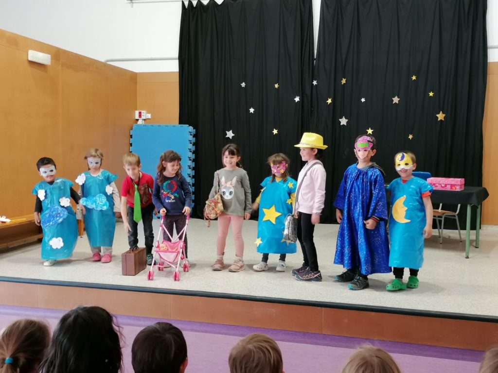 En acabar el segon trimestre, al taller de teatre, un grup de nens i nenes de p4 i p5 han representat l’obra:”Déu meu, quin embolic!!” per a la resta dels alumnes d’infantil.