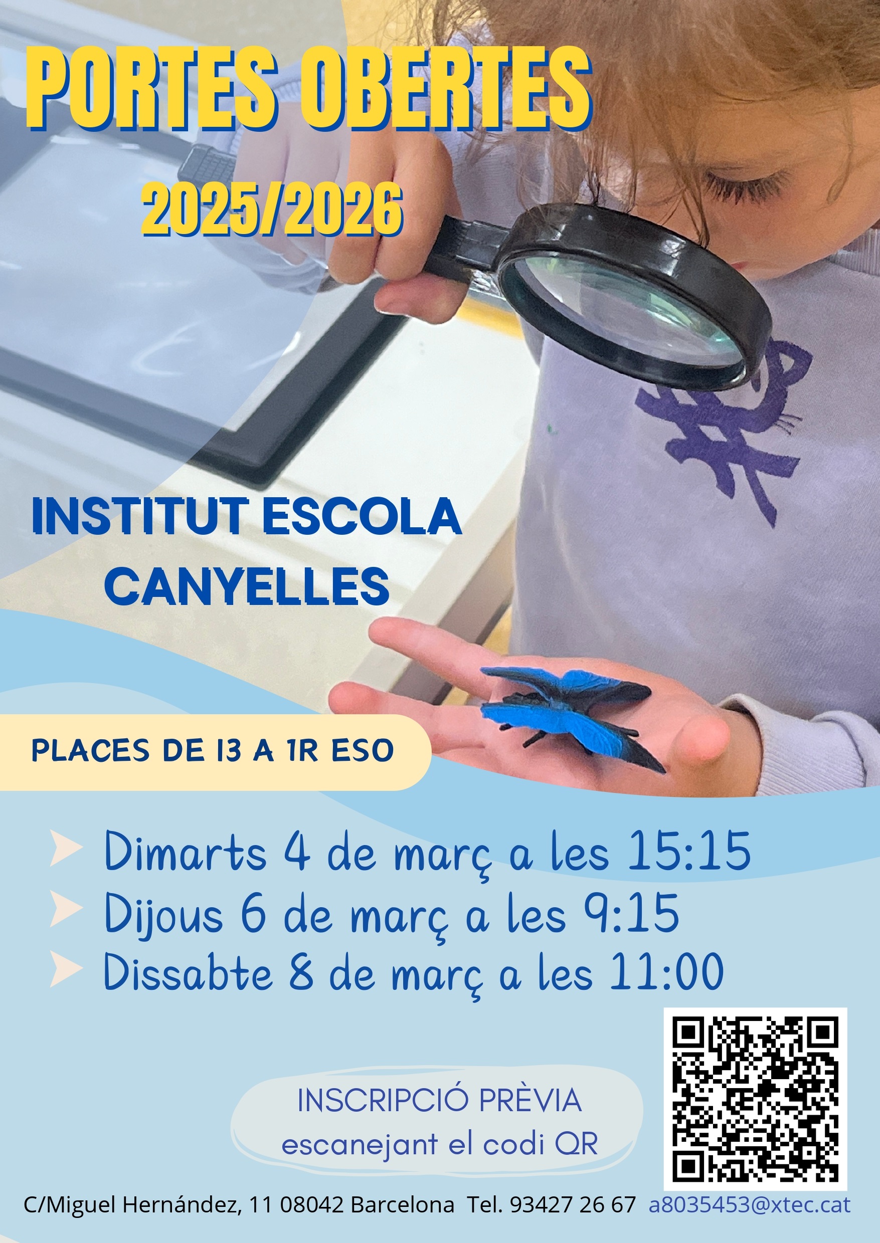 Ens fa molta il·lusió poder compartir amb vosaltres les dates de Portes obertes per a l’escola el proper curs, quan esdevindrà: Institut Escola Canyelles. Amb aquest canvi, com sabeu, donem resposta a les demandes d’esdevenir institut escola que moltes famílies i l’AFA ens heu fet els darrers anys. Creiem que és un repte emocionant, i que podrem millorar les condicions d’educabilitat dels vostres fills i filles, garantint que es puguin quedar al barri estudiant la secundària.
