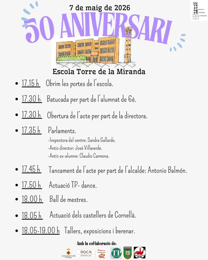S’apropa el 50 aniversari de l’escola! Com ja us vam informar en el seu dia, el proper dijous 7 de maig, de 17,15h, a 19h, celebrarem el 50 aniversari de la nostra escola. Us adjuntem el programa. Hi hauran tallers i berenar per l’alumnat, i comptarem amb la presència de l’Alcalde de Cornellà, Inspecció, antics alumnes i antics […]