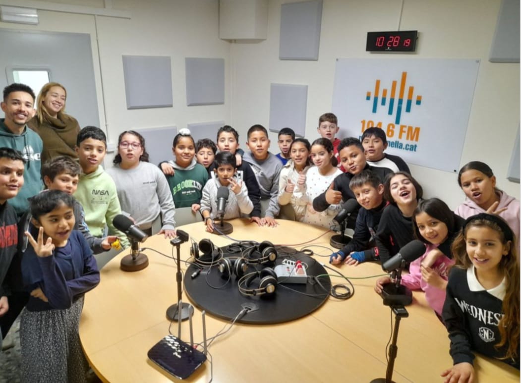 Gravació de ràdio amb els nens i nenes de 5è a Radio Cornellà