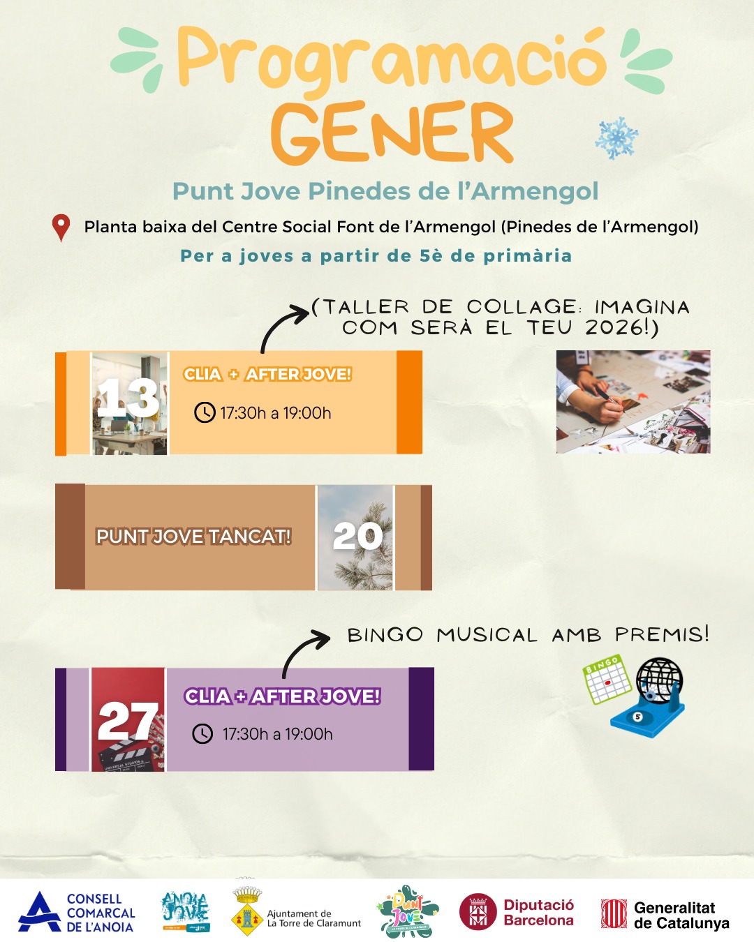 Aquest mes de gener, al Punt Jove de Pinedes de l’Armengol, tornem a emprendre les activitats després d’un 2025 que ha estat tot un èxit de participació i propostes. Comencem l’any amb noves trobades plenes de creativitat, joc i implicació.