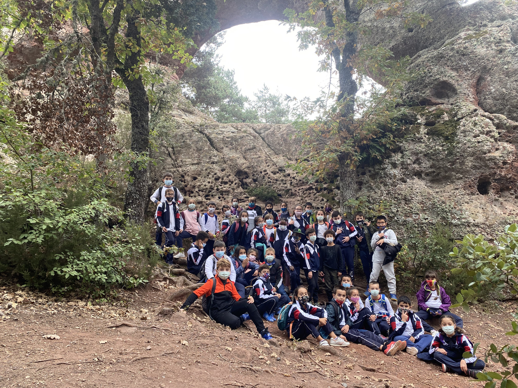 Després vam caminar pel bosc i vam veure els arbres amb els colors de la tardor; també pinyes , castanyes, glans, una serp i insectes… Vam arribar a la roca Foradada on ens vam fer una foto de grup.