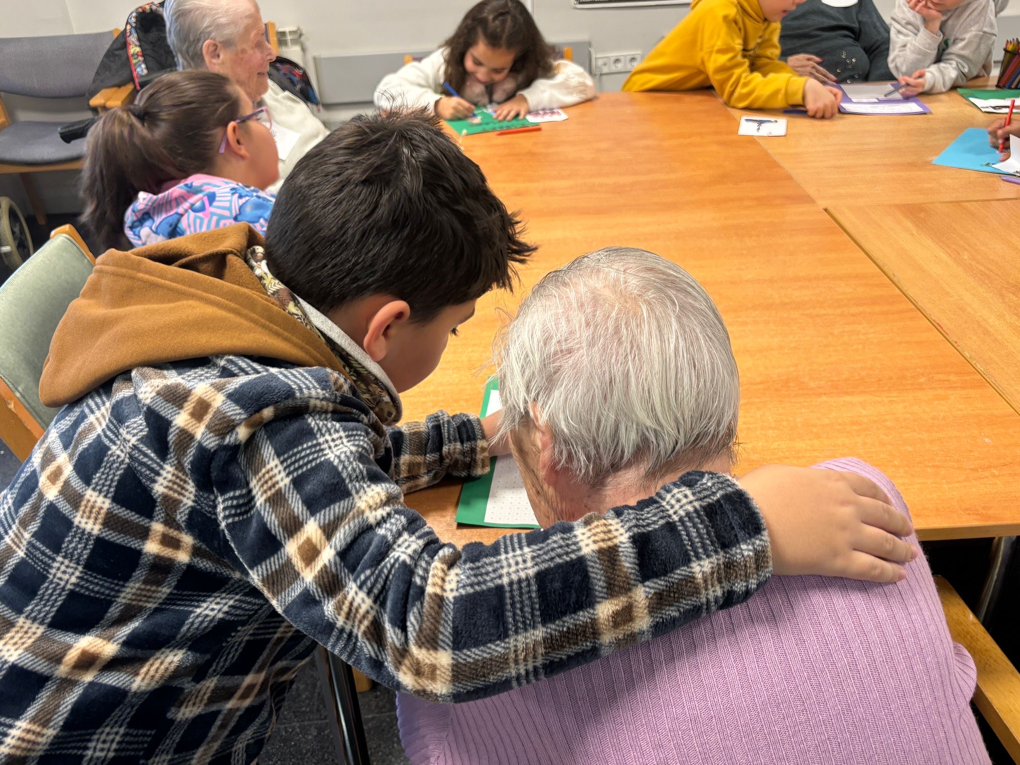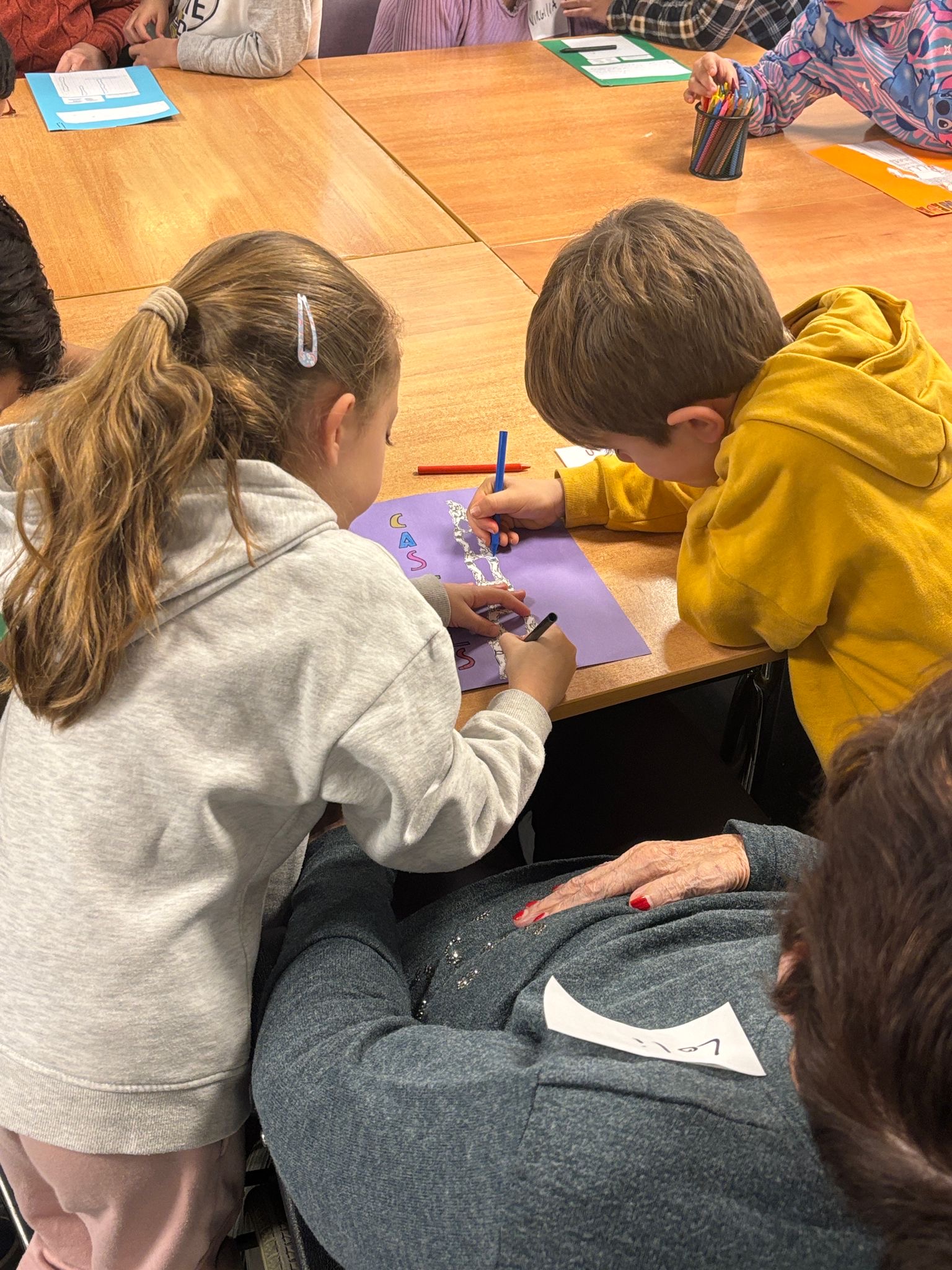 Els nens i nens, amb molta il·lusió, van preparar materials relacionats amb els elements més emblemàtics de la festa major. Van elaborar una sopa de lletres amb paraules relacionades amb els elements del seguici festiu i van crear dibuixos perquè els avis i àvies poguessin resoldre-les i pintar-los plegats. Durant l’activitat, petits i grans van gaudir d’un ambient ple de complicitat i aprenentatge.