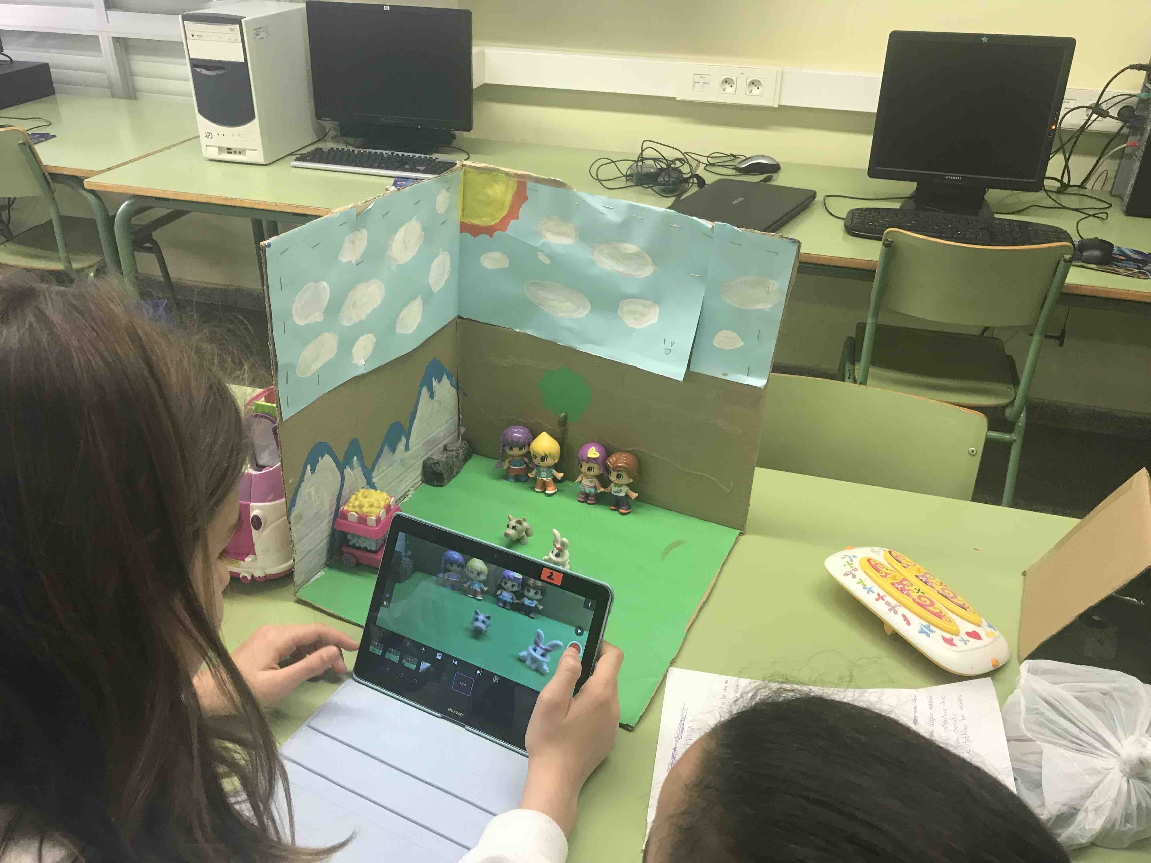 • Stop Motion: Creació i representació d’històries amb decorats propis, petits ninos o personatges dibuixats a través de la tècnica de gravació de l’app gratuïta Stop Motion. Els alumnes treballen prèviament, amb la plataforma Google Workspace, el guió del que volen representar i l’escenificació, fent finalment l’edició de vídeo i so del seu treball seguint els passos que ells mateixos han decidit.