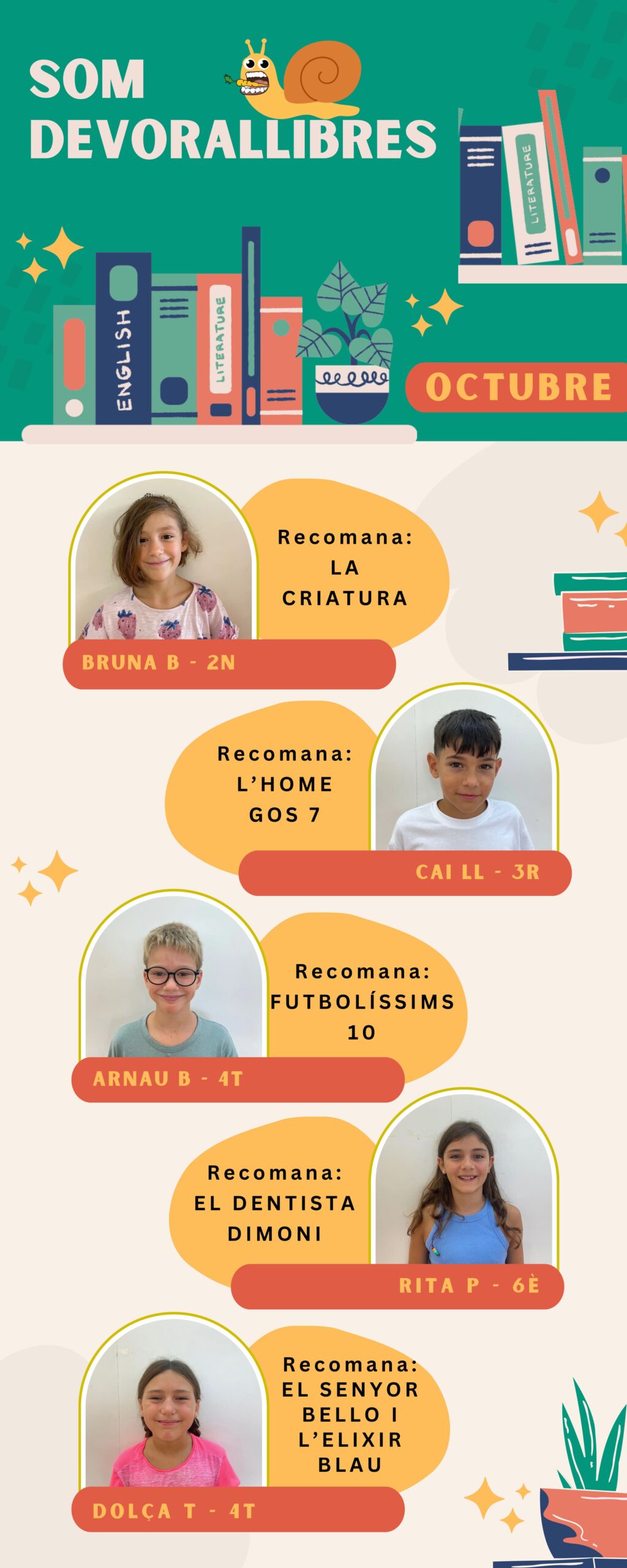 Els devorallibres! Feu un comentari / Per Escola / 7 de novembre de 2025 / Biblioteca General Primària Aquestes son les recomanacions que ens fan alguns dels alumnes de l’escola. Us animem a gaudir de la lectura tal i com ho fan ells!