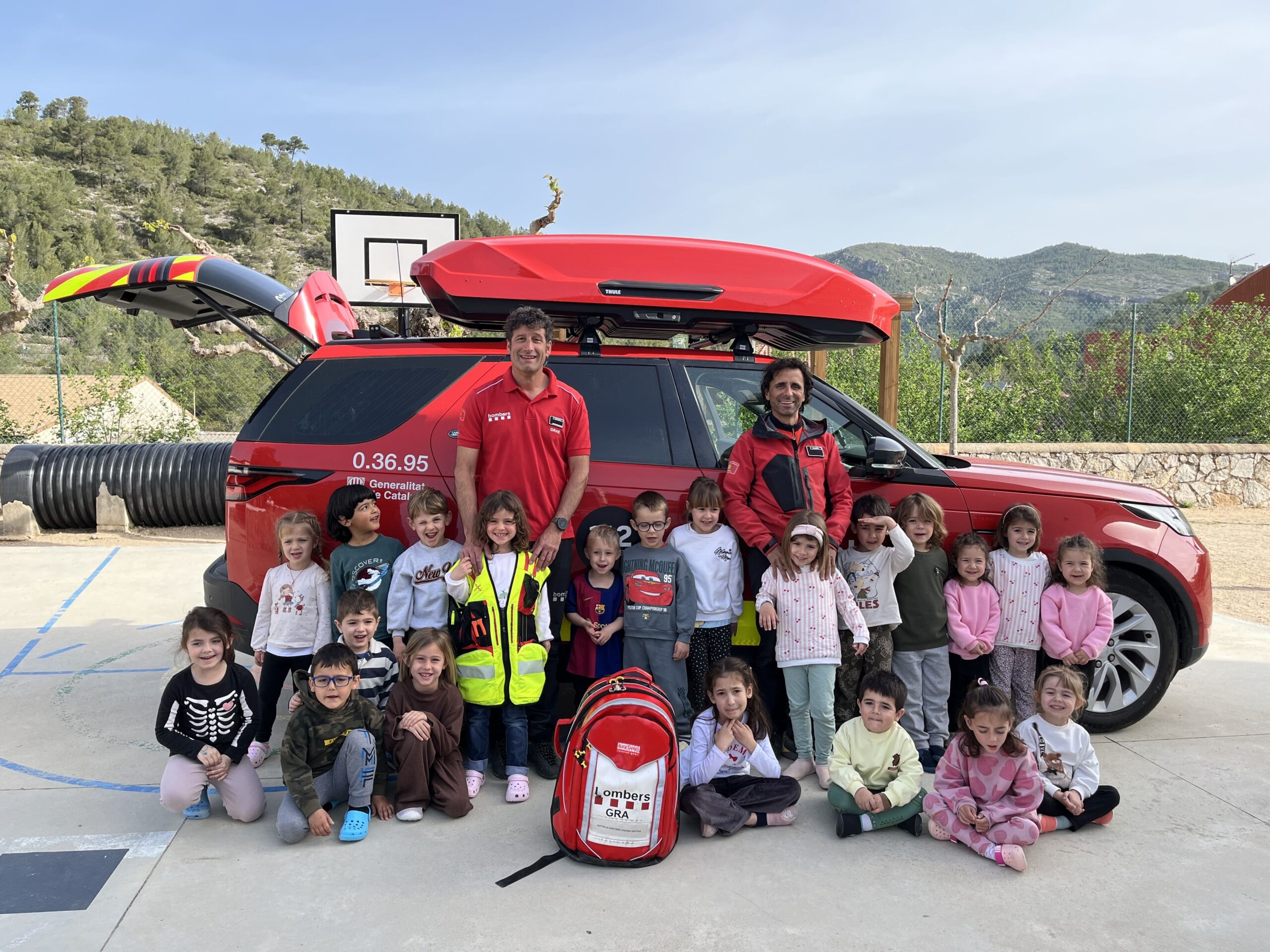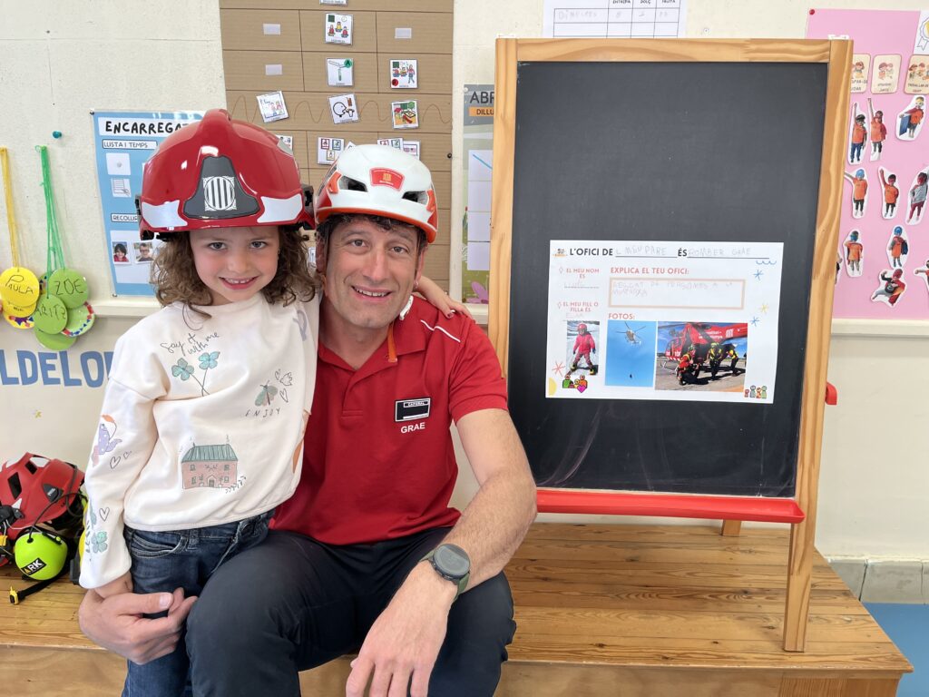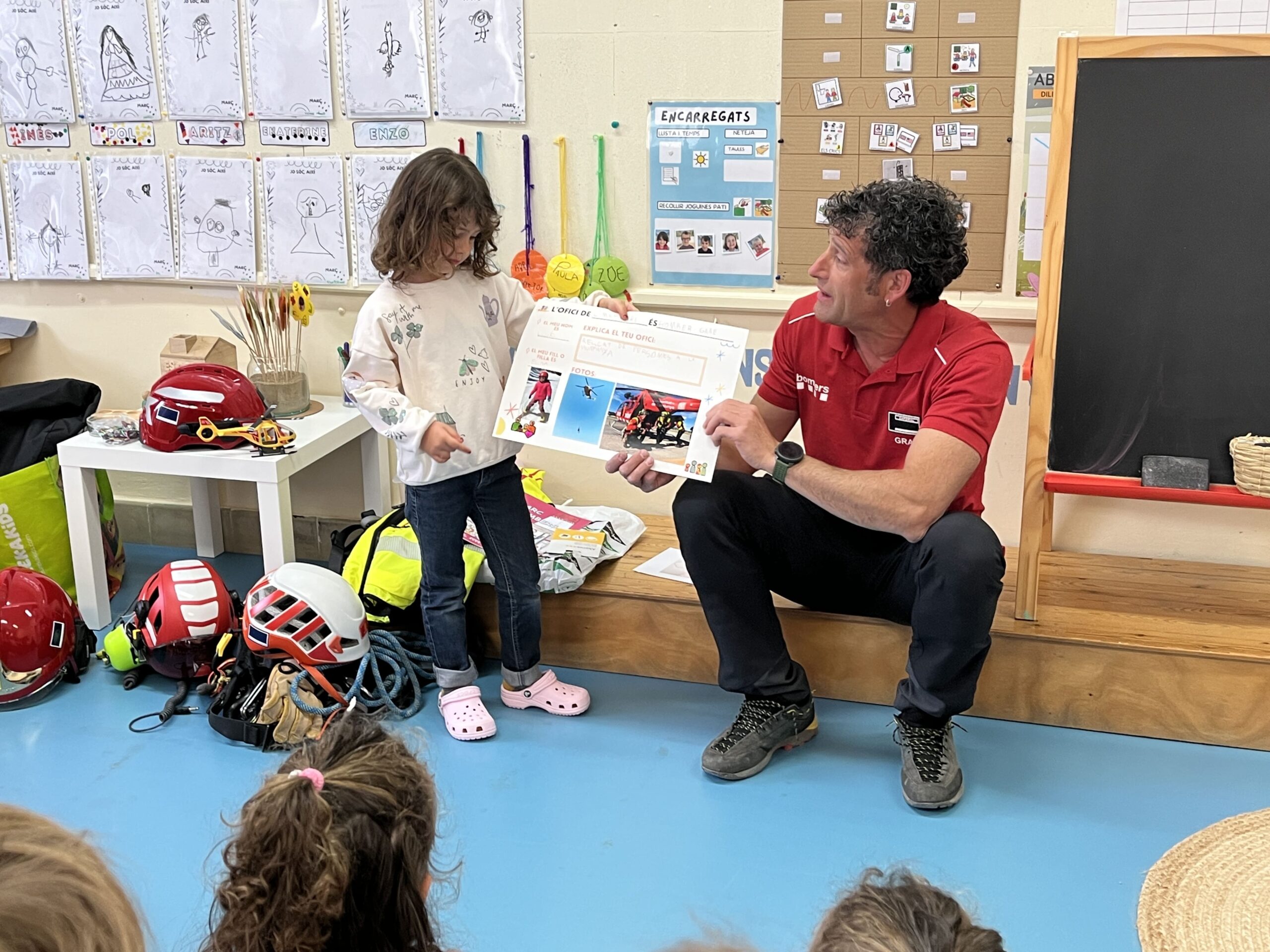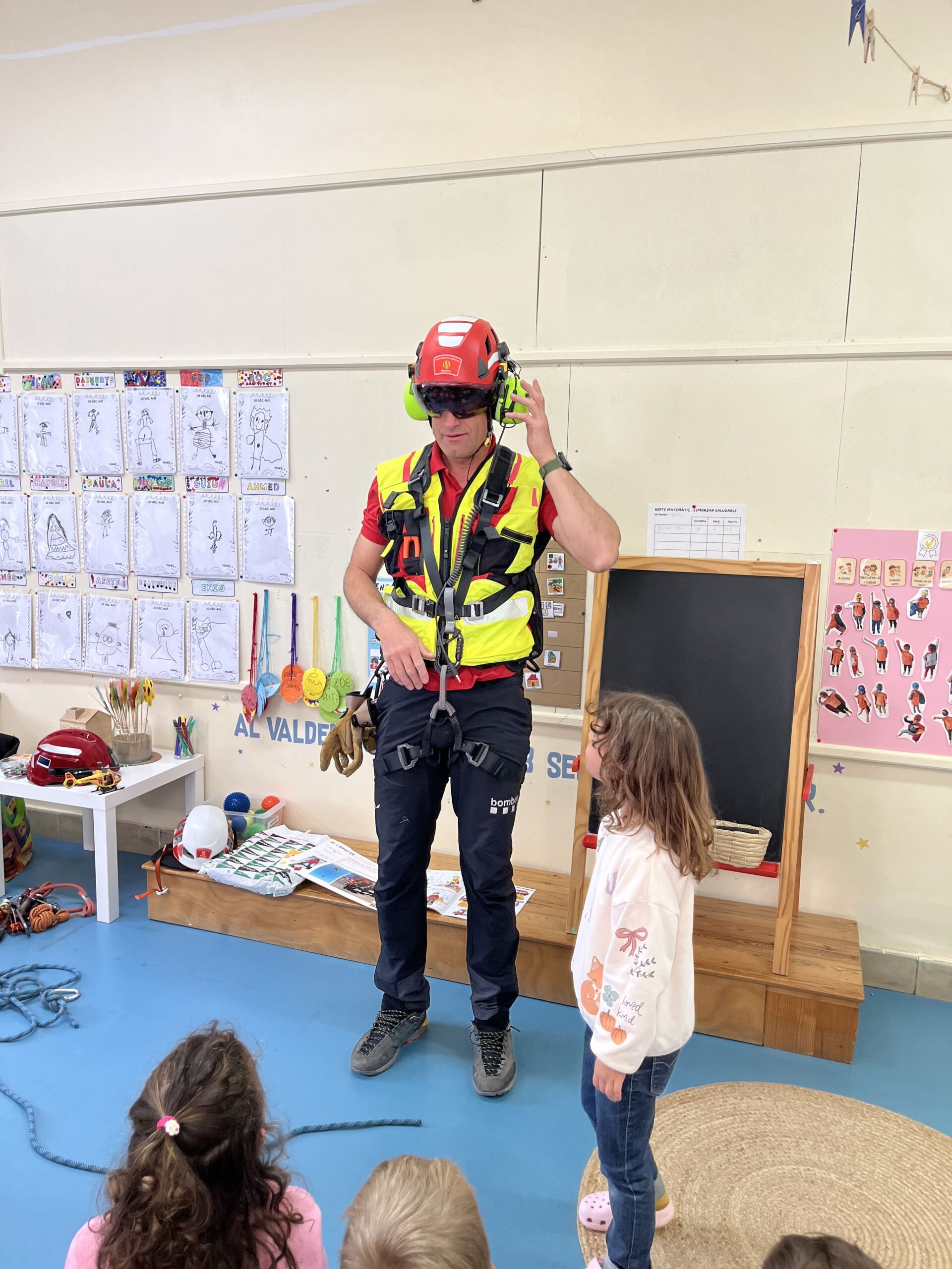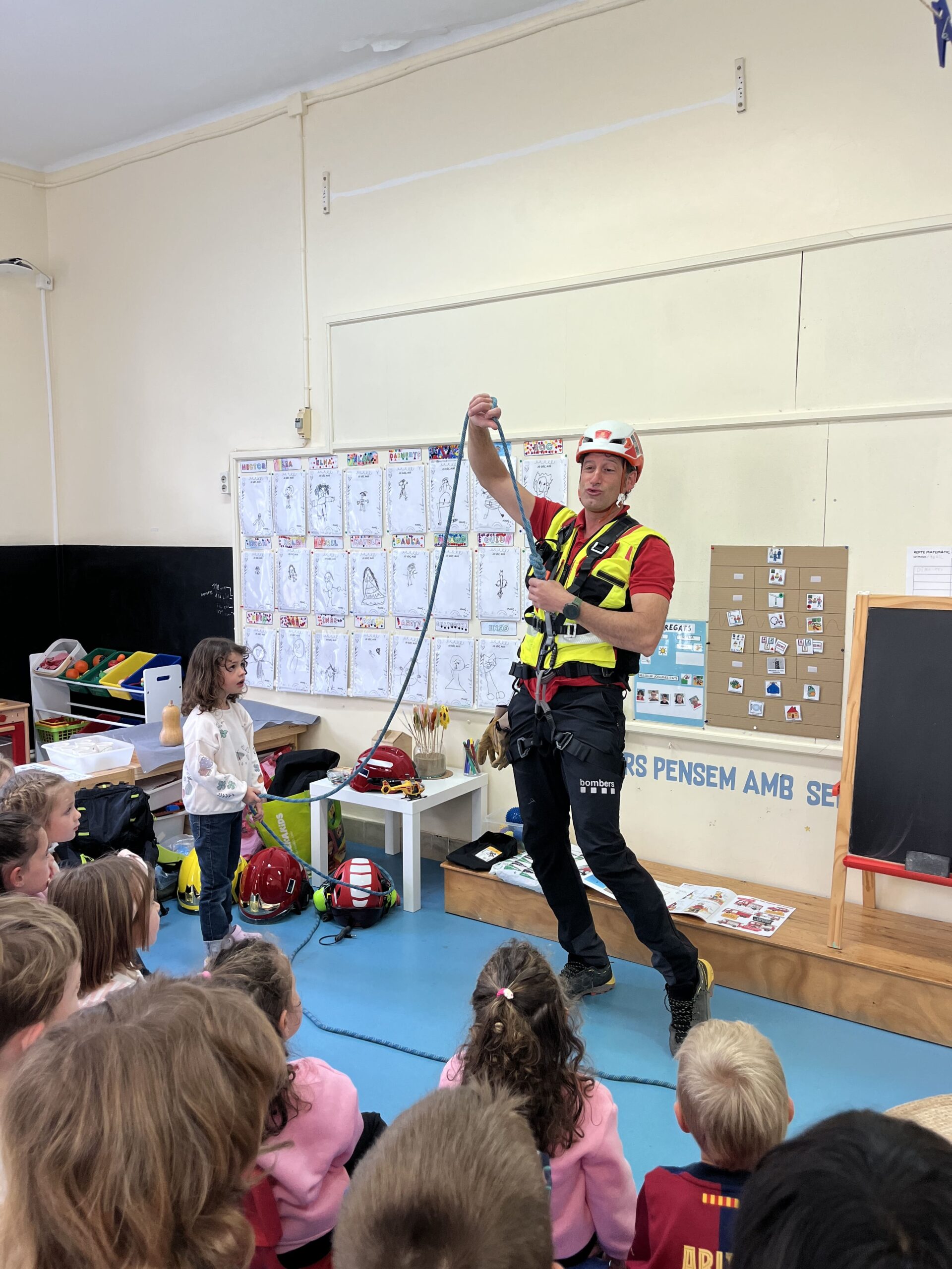 Avui ens ha visitat el pare de l’Elna. El Lluís treballa de bomber, però no apagant foc com tothom podria pensar; ell treballa en un grup que realitza rescats de muntanya!