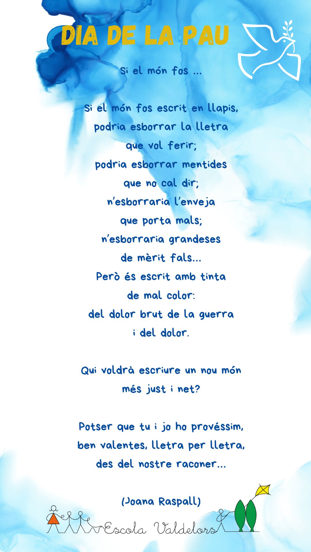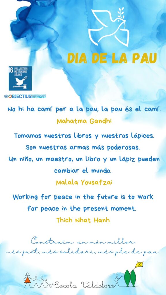 El 30 de gener se celebra el dia Escolar de la No-violència i la Pau , una iniciativa d’Educació No-violenta i Pacificadora, difosa internacionalment. A l’Escola hem celebrat tota la comunitat educativa, des dels petits als grans, a tots els racons i moments com també al menjador . Hem fet activitats tots junts, i de treballar des de cada comunitat diferents activitats per entendre com volem conviure a l’escola millor.