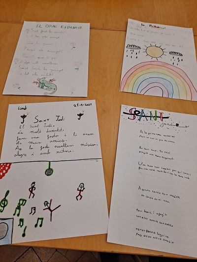 Us deixem una mostra de Sant Jordi: Rodolins cooperatius a p4 (imatge portada), Poemes de 4t, poemes de 2n, Conte compartit de p3A, contes compartits entre p5A i p5B(cada grup ha fet un inici i l’altre grup el final) …ah!