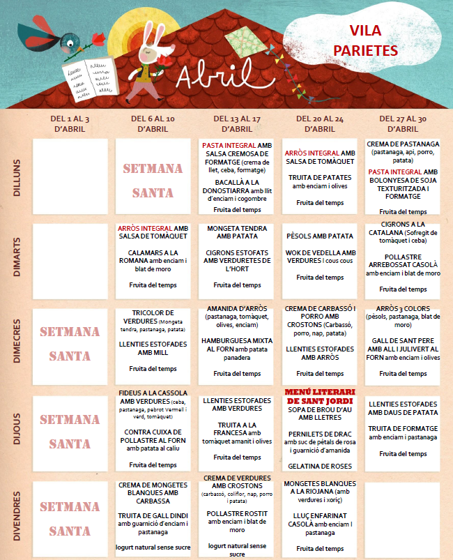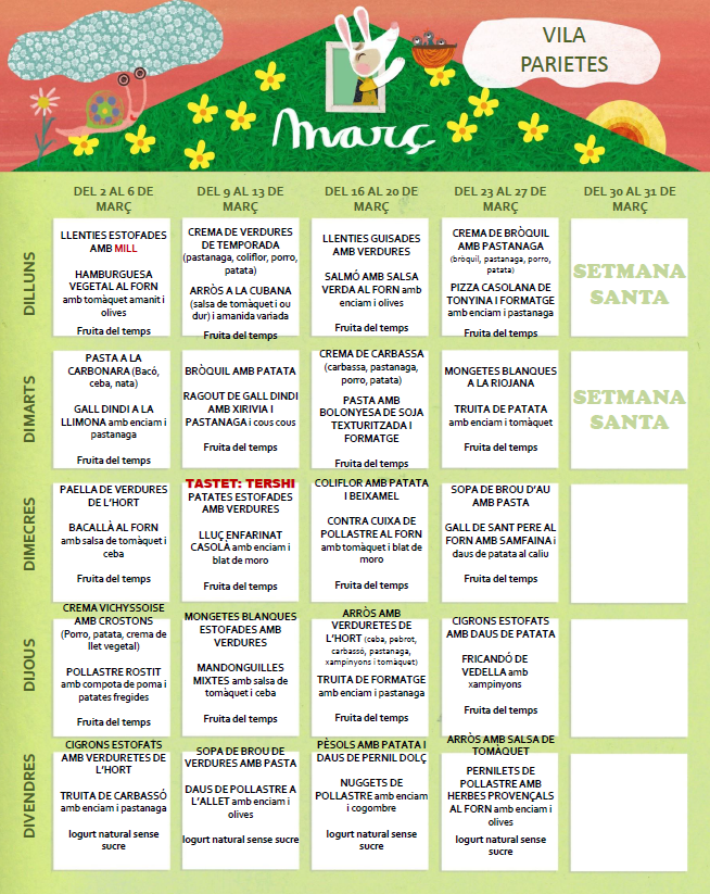 Menjador escolar L’escola disposa de menjador i cuina pròpia, el menjar s’elabora diàriament al centre. El menjador està gestionat per l’empresa TENO. Telèfon servei de menjador: 610372793 Horari d’atenció telefònica i whatsapp: 7:30h a 9:30h