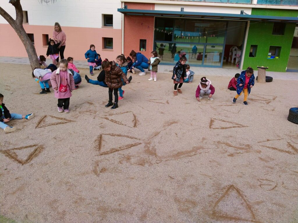 A I3 descobrim el triangle, caminant per sobre, resseguint triangles i traçant triangles a la sorra del pati.
