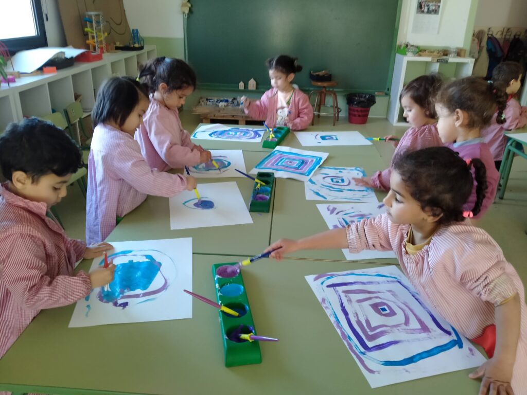 A I3 seguim amb el treball de traç combinat amb la creació i les formes geomètriques. En aquest cas hem fet quadrat concèntric amb colors d’hivern: blau, lila. blanc. Experimentar amb el pincell, primer amb una consigna i després de manera més lliure els fa enternar la seva psicomotricitat fina, la seva cooridnació òculo manual, i niciar-se en el traç.