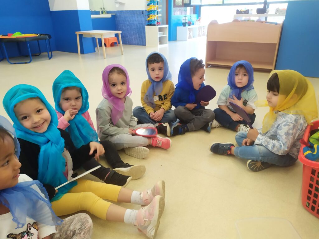5. Escolta del conte de LA CASTANYERA ben guarnits amb un mocador al cap i danses de les cançons treballades.
